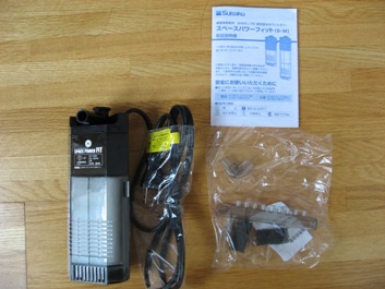 「アクアリウム・インプレッション」 その記念すべき第一回は、 水槽のコーナーにぴったりフィットするスリムなボディに、小さな工夫が満載の 水中式フィルター。 水作「スペースパワーフィットS」です (メーカーの製品紹介ページhttp://www.suisaku.com/products/p0103.html (詳しい寸法が載っています) <セット内容>