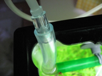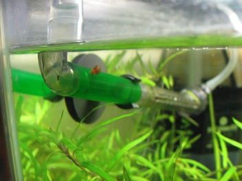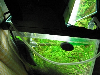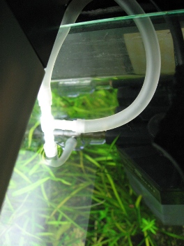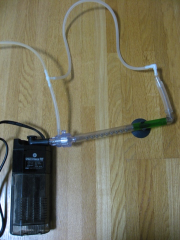 × [PR]上記の広告は3ヶ月以上新規記事投稿のないブログに表示されています。新しい記事を書く事で広告が消えます。 スペースパワーフィットにエーハイムのディフューザーを取り付けたところ。 今回はこれの水流を弱め、同時に添加効率も上げる試みです 水中フィルターにディフューザーを取り付けて 二酸化炭素を添加する方法はわりとメジャーですが そのままでは水草水槽にはちょっと水流が強い……。 そんな悩みを解決すべく考えた小ネタです。 奥からフィルター、ディフューザー、シャワーパイプ 継ぎ手、パイプ、L型継ぎ手、ホース。 継ぎ手はスペースパワーフィットの付属品 シャワーパイプとキスゴムはエーハイム製 ディフューザーはその性質上 あまり流量を落とすと効果がなくなってしまうため 効果を保ちつつ水流を弱めたい時 一番簡単な方法はシャワーパイプを使う事です。 しかしそのままではパイプの中で泡同士がくっついてしまい 粒の大きい泡が多くなるため、添加効率が落ちますし、 何よりシャワーパイプの端から ポコポコ排出される音が気になります。 そこでCO2のロスと音の原因である 大きい気泡だけをトラップし、再びディフューザーに戻す仕組みを作りました。 パイプ全体をキスゴムで支え、やや斜め上に向けることにより 大きい気泡だけが画像の右上に溜まります。 小さい気泡のみが水流に乗ってシャワーパイプから水中へ 水槽奥に設置されたディフューザーから 手前に向かってやや斜めにパイプを延長し そのパイプの端からホースを立ち上げます。 これで本来ならシャワーパイプの端から漏れてしまう 大きな気泡を、再利用することができます。 L型継ぎ手につながれたホース 太い方から13/9ミリ、9/6ミリ、6/3ミリ ここでCO2の大きな泡を回収 この場合揚水の限界が水面からおよそ5センチなので 太いホースをそれ以上の長さにすることで ホース内の水を立ち昇ってくる気泡のみをトラップ出来ます。 トラップされたCO2は 三又分岐でディフューザーに戻って 再度細かい気泡に。 CO2の泡は再びディフューザーに戻って シャワーパイプに送られ、 水流にのる細かい泡のみが水槽内に出ていくので ポコポコ音もしませんし、添加効率も上がり 機能面ではなかなか満足いくものが出来ました。 全体図 もともとが水草ストック水槽用にアリモノを組み合わせて 使っていたものなので、見栄えが悪いですが その割には当初の目標(消音、添加効率UP)を すべて達成でき、メンテナンスもほぼ不要と 見た目以外は優秀なシステムになりました。 水中フィルターでCO2添加していて 見た目を全く気にしない方には お勧めの方法かもしれません^^;